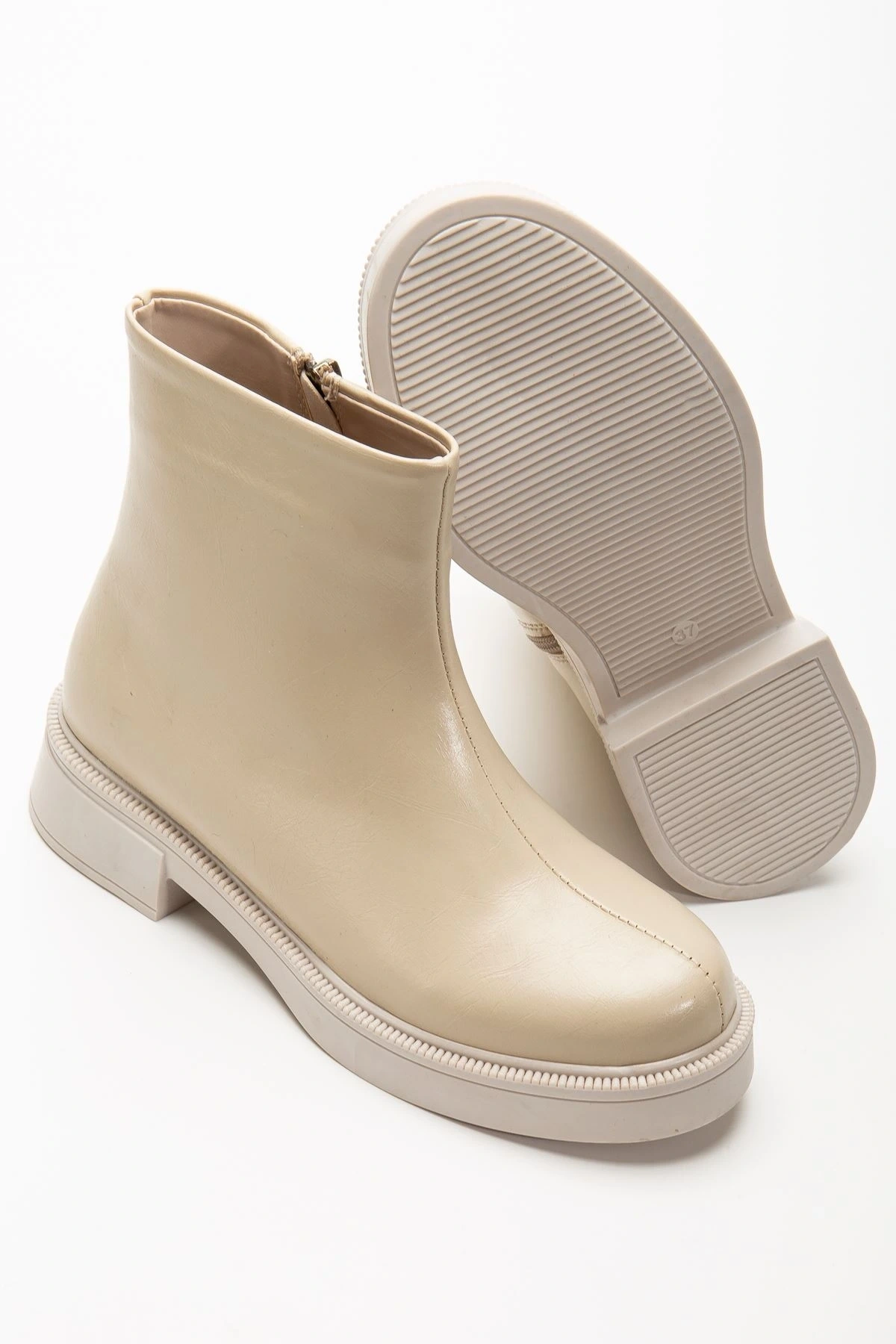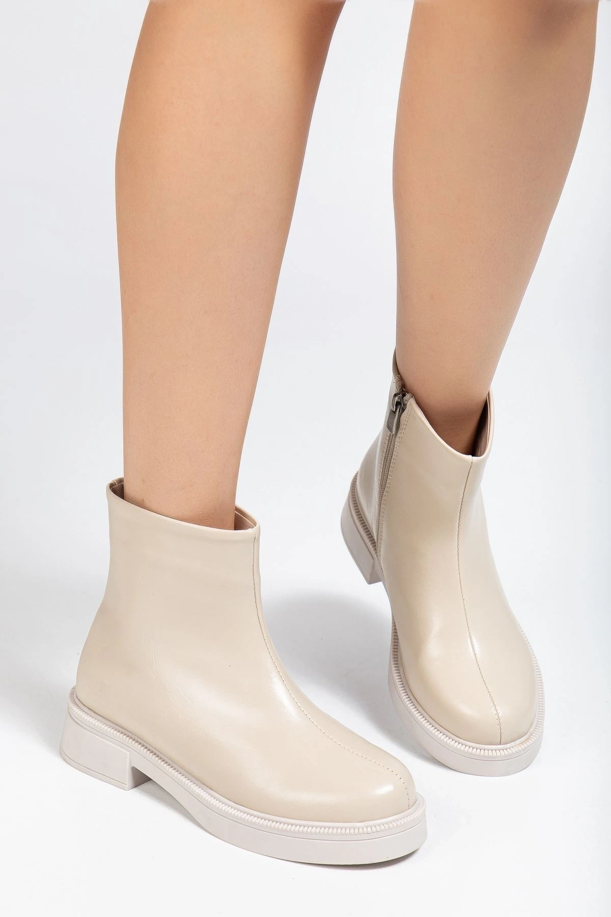 02-356 Bej Düz Topuklu Bağcıklı Fermuarlı Günlük Kadın Bot