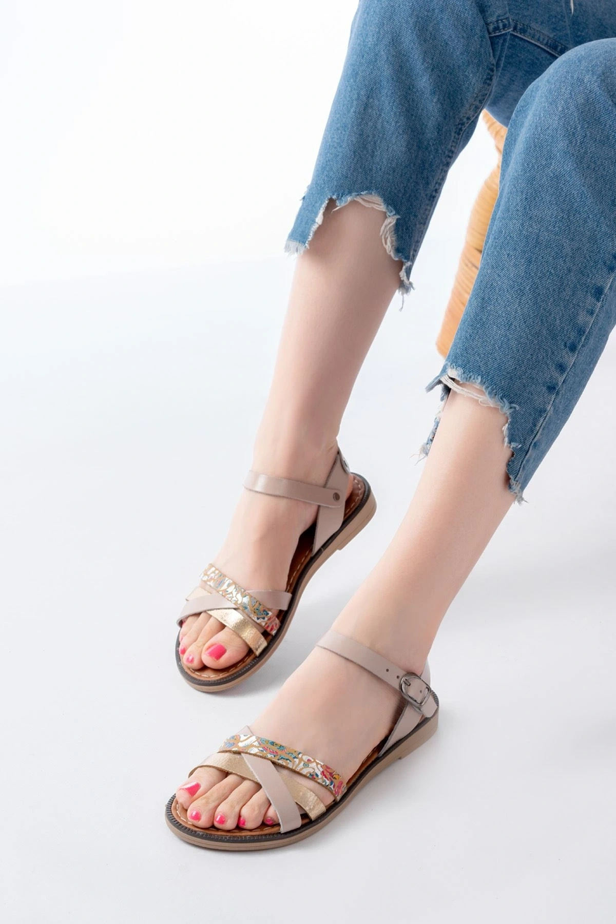 1001-1100 Bej Gümüş Taşlı Günlük Kadın Sandalet