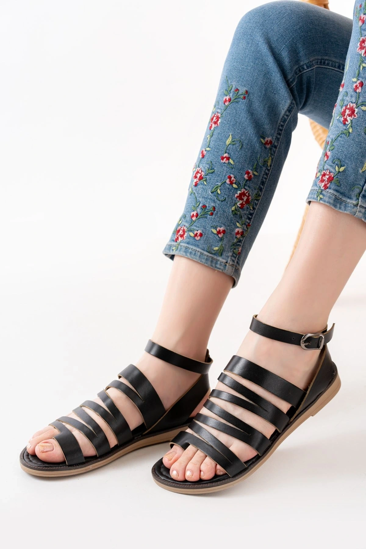 205-01 Siyah Bilekten Bağlamalı Ortopedik Hakiki Deri Kadın Sandalet
