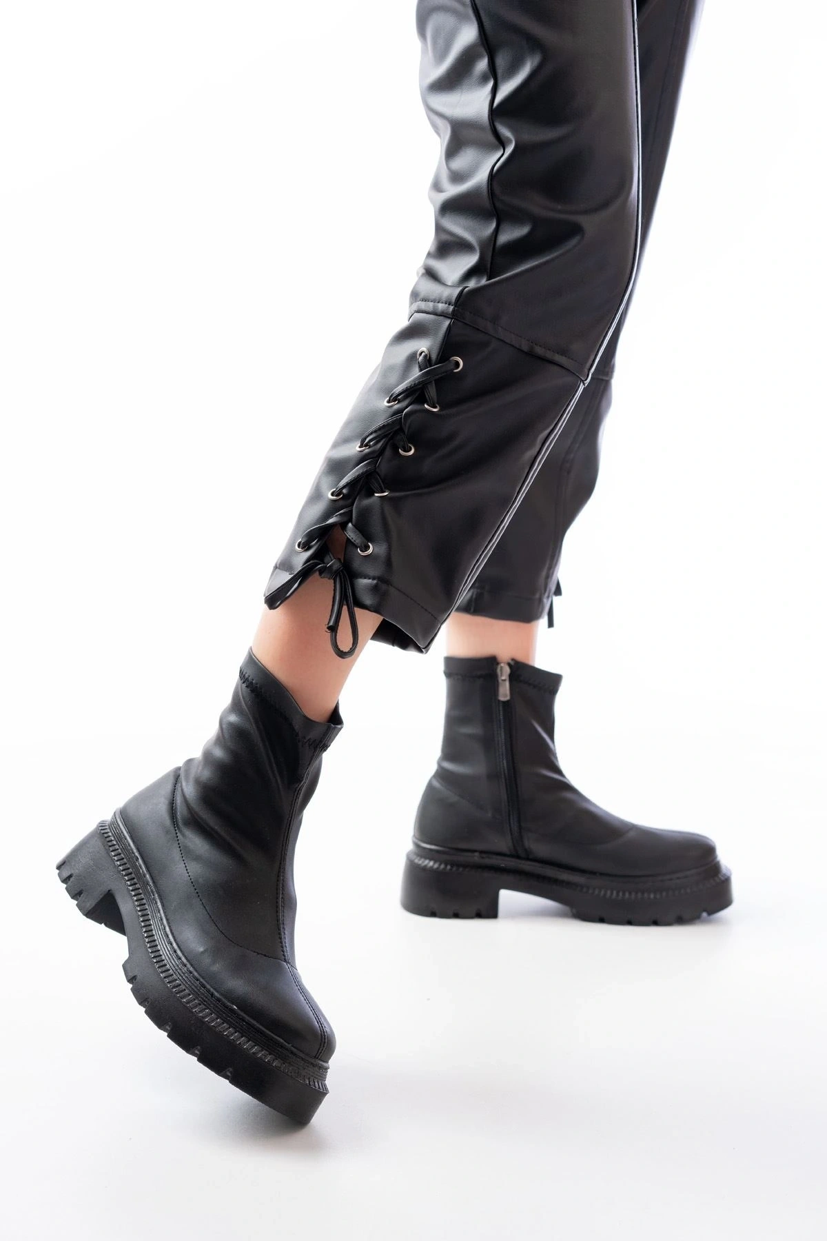 02-356 Siyah Düz Topuklu Bağcıklı Fermuarlı Günlük Kadın Bot