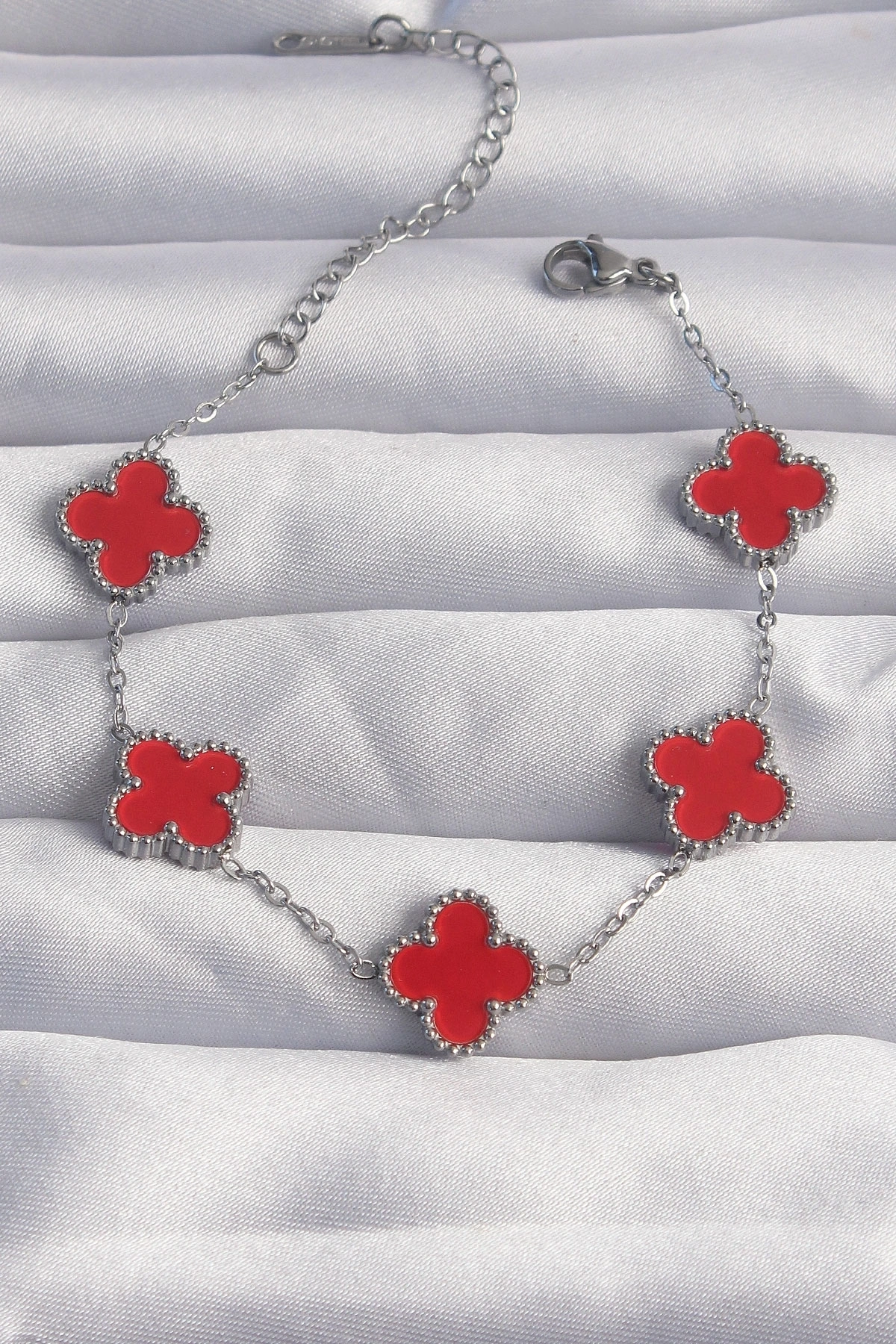 316L Çelik Gümüş Renk Kırmızı Mineli Yonca Bileklik