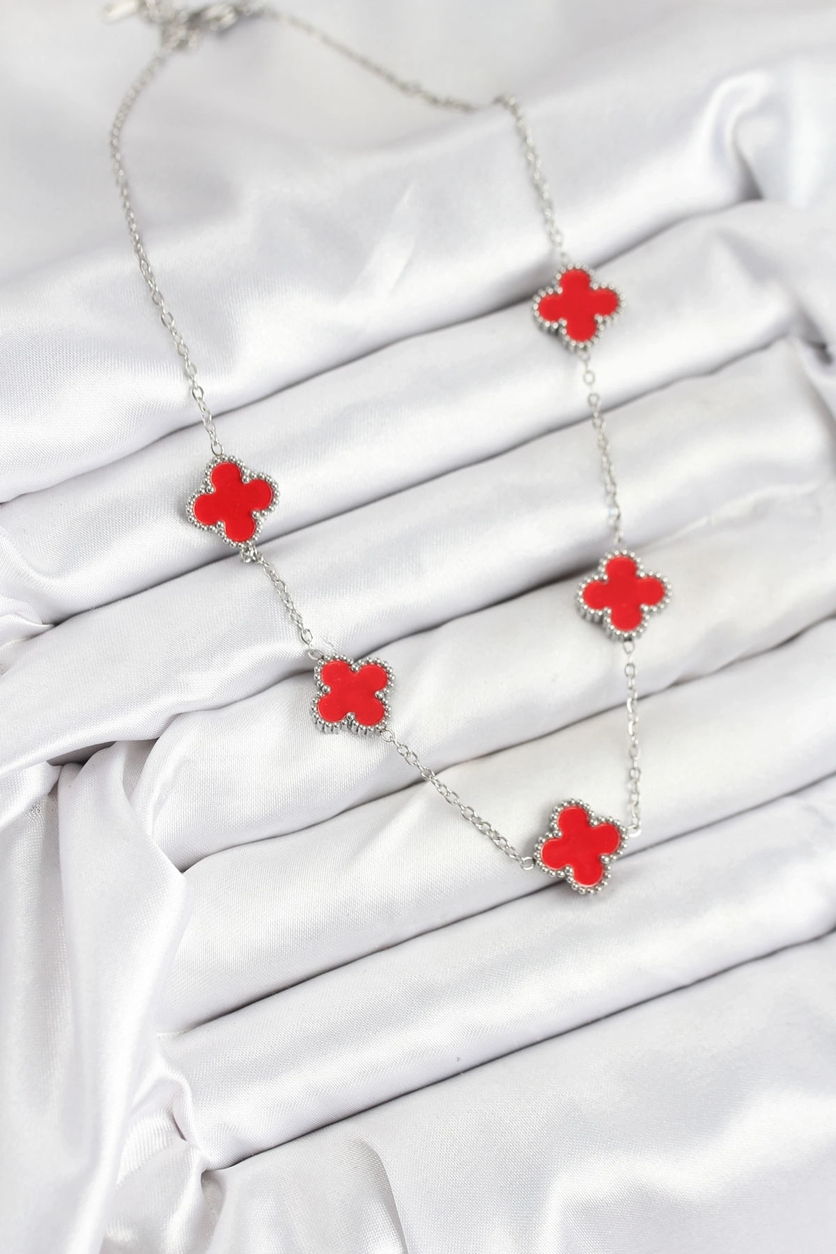 316L Çelik Zincir Gümüş Kırmızı Renk Yonca Kadın Kolye