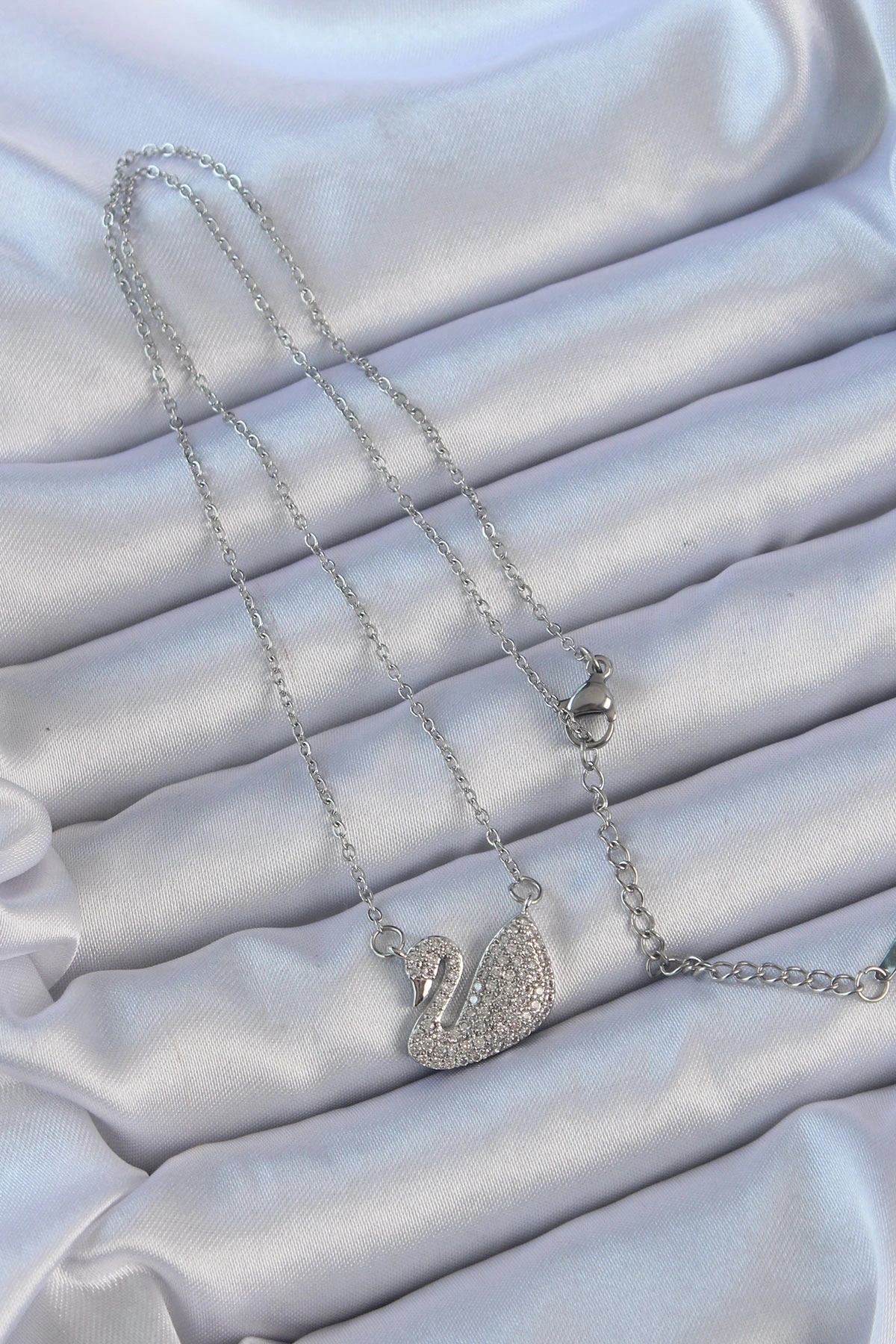 316L Çelik Zincir Gümüş Renk Zirkon Taşlı Kuğu Kolye
