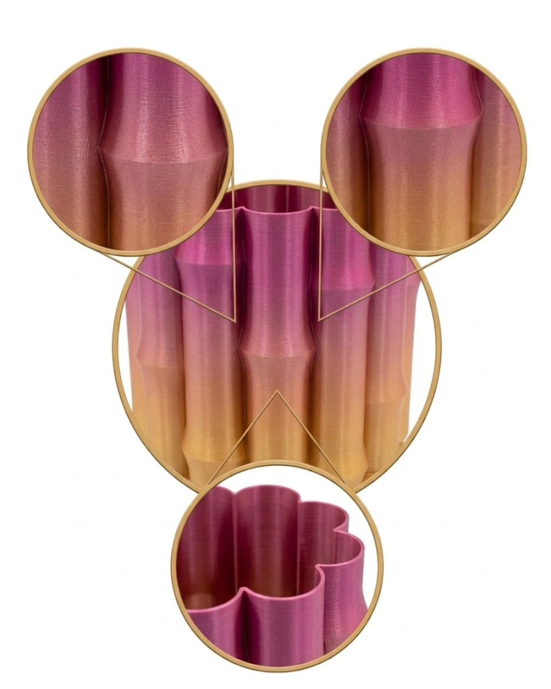 Şık ve modern bir yaşam alanı oluşturmak isteyenler için tasarlanan mor sarı degrade 3D vazo, dekorasyonunuza farklı bir boyut kazandırır. Özgün kıvrımlı yapısı ve dikkat çekici renk geçişi sayesinde bulunduğu ortamda odak noktası haline gelir.Estetik tasarımının yanı sıra fonksiyonel kullanımı ile de öne çıkar. İster çiçeklerle ister tek başına dekoratif obje olarak kullanılabilir. Modern, bohem ve çağdaş dekorasyon tarzlarına uyum sağlayarak yaşam alanlarınıza uyumlu bir bütünlük sunar.Kaliteli ve dayanıklı yapısı sayesinde uzun süreli kullanım sağlar. Ev, ofis, kafe veya stüdyo gibi farklı alanlarda tercih edilebilir. Aynı zamanda sevdiklerinize şık ve farklı bir hediye alternatifi olarak da değerlendirilebilir.