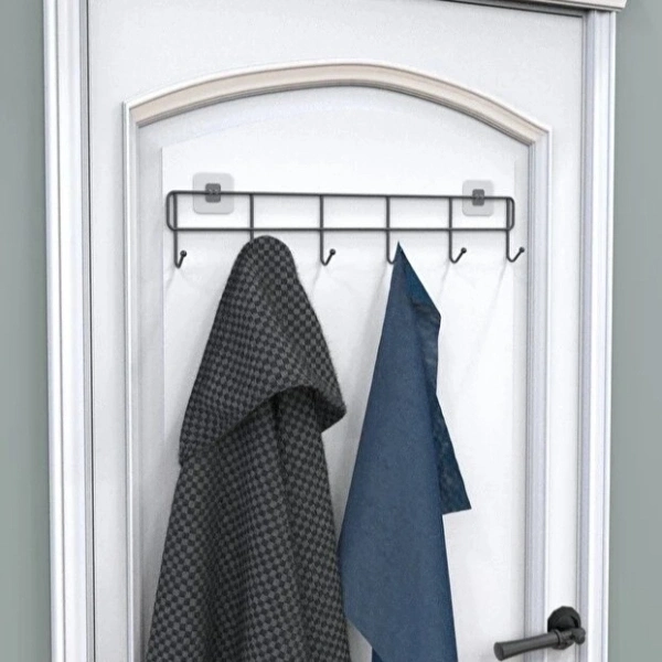 6'LI YAPIŞKANLI KAPI ARKASI ASKIÜrün Özellikleri6'lı yapışkanlı kapı arkası askı, ev ve ofis düzenini pratik şekilde sağlamak isteyenler için tasarlanmış fonksiyonel bir depolama çözümüdür. Delme veya vidalama gerektirmeyen yapışkanlı kapı arkası askı tasarımı sayesinde kapı, dolap kapağı veya düz yüzeylere kolayca uygulanabilir. Toplam altı askı bölümüne sahip olan ürün; mont, ceket, çanta, havlu, bornoz ve aksesuar gibi eşyaların düzenli şekilde asılmasına imkân tanır. Dayanıklı metal gövdesi sayesinde günlük kullanımda sağlam duruş sergilerken, siyah renkli sade tasarımı ile her ortama uyum sağlar. Yaklaşık 45 cm genişliği sayesinde alanı verimli kullanır ve dar alanlarda bile yüksek depolama avantajı sunar. Ev, banyo, mutfak ve ofis gibi alanlarda tercih edilen çok amaçlı duvar askısı, düzenli ve toplu bir görünüm elde etmeye yardımcı olur.Ürün Teknik Özellikleri Özellik Açıklama Ürün Adı 6'lı Yapışkanlı Kapı Arkası Askı Askı Sayısı 6 adet Genişlik 45 cm Yükseklik 9 cm Malzeme Dayanıklı metal Montaj Yapışkanlı, delmesiz kullanım Kullanım Alanı Kapı arkası, dolap, duvar Kullanım Amacı Düzenleme ve asma çözümü Paket İçeriği1 adet 6'lı yapışkanlı kapı arkası askı