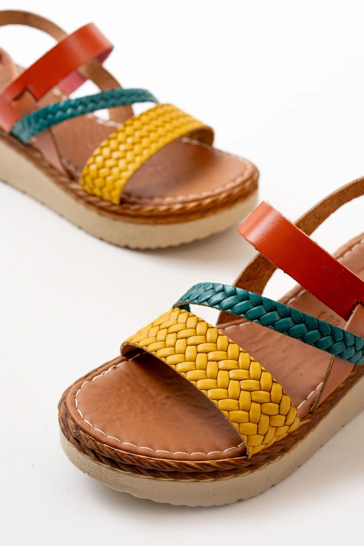 730-152 Bej Örgü Desenli Hakiki Deri Ortopedik Taban Kadın Sandalet