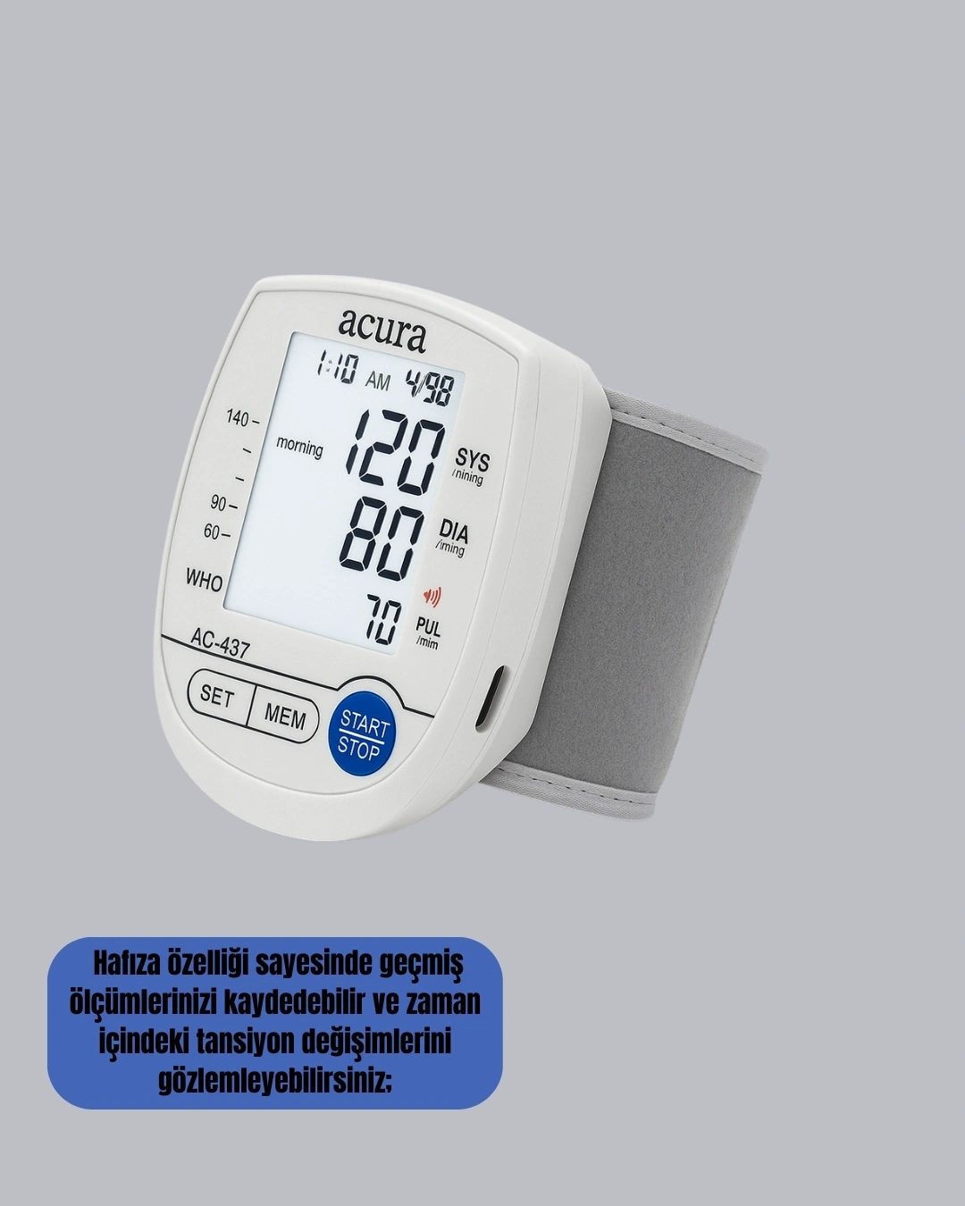 Hem pilli hem şarjlı çalışma özelliğine sahip bu bilekten tansiyon ölçer, günlük tansiyon takibini en pratik ve güvenilir şekilde yapabilmeniz için tasarlanmıştır. Bileğe kolayca takılır ve tek tuşla hızlı ölçüm yapar. Dijital ekranı büyük ve nettir; yaşlı kullanıcılar dahil herkes ölçüm sonuçlarını rahatlıkla görebilir. Ölçüm saniyeler içinde tamamlanır ve cihaz tansiyon değerlerini anlaşılır bir şekilde ekranda gösterir. Pilli kullanım seçeneği, cihazı dilediğiniz her yerde kullanabilmenizi sağlarken, şarjlı mod sayesinde pil değişimi derdinden de kurtulursunuz. Bu çift güç sistemi cihazı hem ekonomik hem de son derece kullanışlı hâle getirir. Hafıza özelliği, önceki ölçümlerinizi saklar ve tansiyon değişimlerinizi düzenli olarak takip etmenize yardımcı olur. Böylelikle sağlık takibinizi daha kontrollü şekilde yapabilirsiniz. Küçük, hafif ve taşınabilir yapısıyla evde, işte, seyahatte ya da dışarıda tansiyonunuzu anında kontrol edebilirsiniz. Güvenilir, modern ve kullanımı kolay bir tansiyon aleti arayanlar için ideal bir seçimdir.