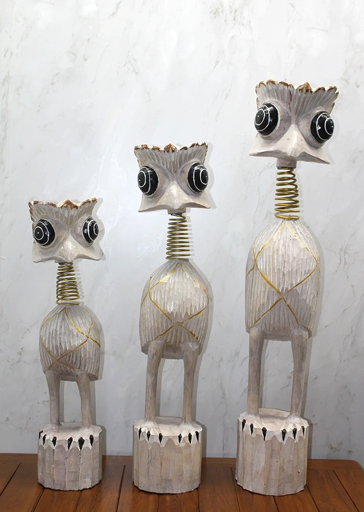 AHŞAP 3'LÜ DEVE KUŞU SETİ 90 CMÜrün Özellikleri60 cm, 70 cm ve 90 cm boyutlarında üçlü set halinde sunulan ahşap deve kuşu figürleri, el boyaması ve işçiliğiyle dikkat çekici bir dekoratif objedir. Her figürün baş kısmı siyah gözlerle tasarlanmış olup, vücutları metal yaylarla hareketli hale getirilmiştir. Doğal ve zarif yapısıyla hem modern hem de şık bir dekorasyon unsuru oluşturur.Paket İçeriği1 Adet Ahşap 3'lü Deve Kuşu Seti 90 Cm