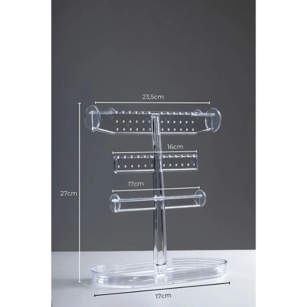 AKSESUAR STANDI TAKI ORGANIZERÜrün ÖzellikleriAksesuar standı takı organizer, şık ve fonksiyonel tasarımıyla küpe, kolye, bileklik ve yüzüklerinizi düzenli bir şekilde sergilemenizi sağlar. 23,5 cm üst genişlik, 16 cm orta kısım ve 17 cm alt genişliği ile farklı boyutlardaki takılar için ideal kullanım sunar. Toplam yüksekliği 27 cm olan bu stand, şeffaf ve dayanıklı plastikten üretilmiştir. Hem evde hem de mağaza vitrinlerinde kullanılabilir. Takılarınızın dolaşmasını önler ve düzenli bir görünüm elde etmenizi sağlar.Paket İçeriği1 adet Aksesuar Standı Takı Organizer