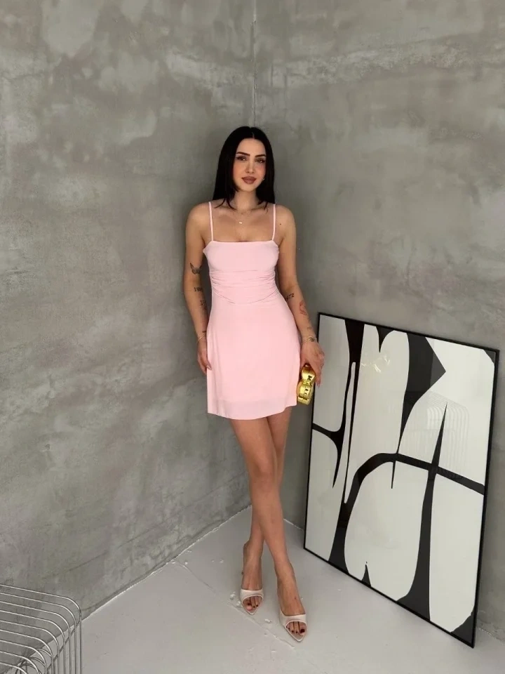 Askılı Şifon Mini Elbise Drapeli Bel Vücuda Oturan Yazlık Şık - Pembe
