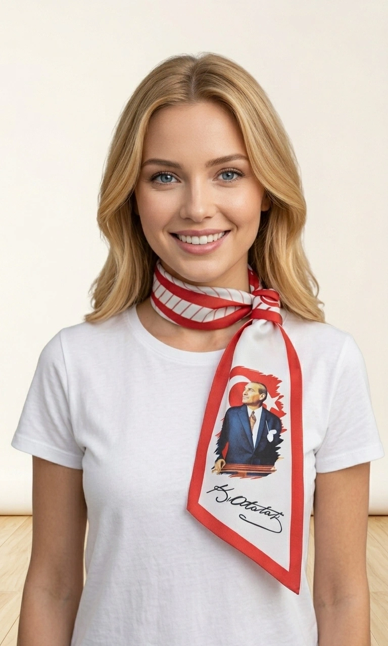 Cumhuriyetimizin kurucusu Gazi Mustafa Kemal Atatürk’ün asaletini ve devrimlerini boynunuzda taşıyın! Hem günlük kombinlerinize şıklık katacak hem de milli bayramlarda gururla tercih edebileceğiniz bu Atatürk temalı fular, zarafet ile vatan sevgisini bir araya getiriyor.