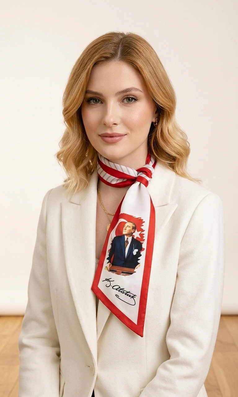 Özel Tasarım: Fuların uç kısmında Atatürk’ün ikonik portresi ve hemen altında dünyaca ünlü ıslak imzası yer almaktadır.