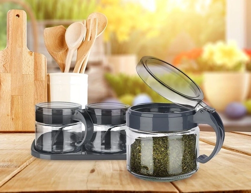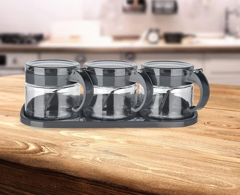 1 Adet 3lü kapaklı cam baharatlık, 3 adet plastik baharat kaşığı, 1 adet baharatlık standı