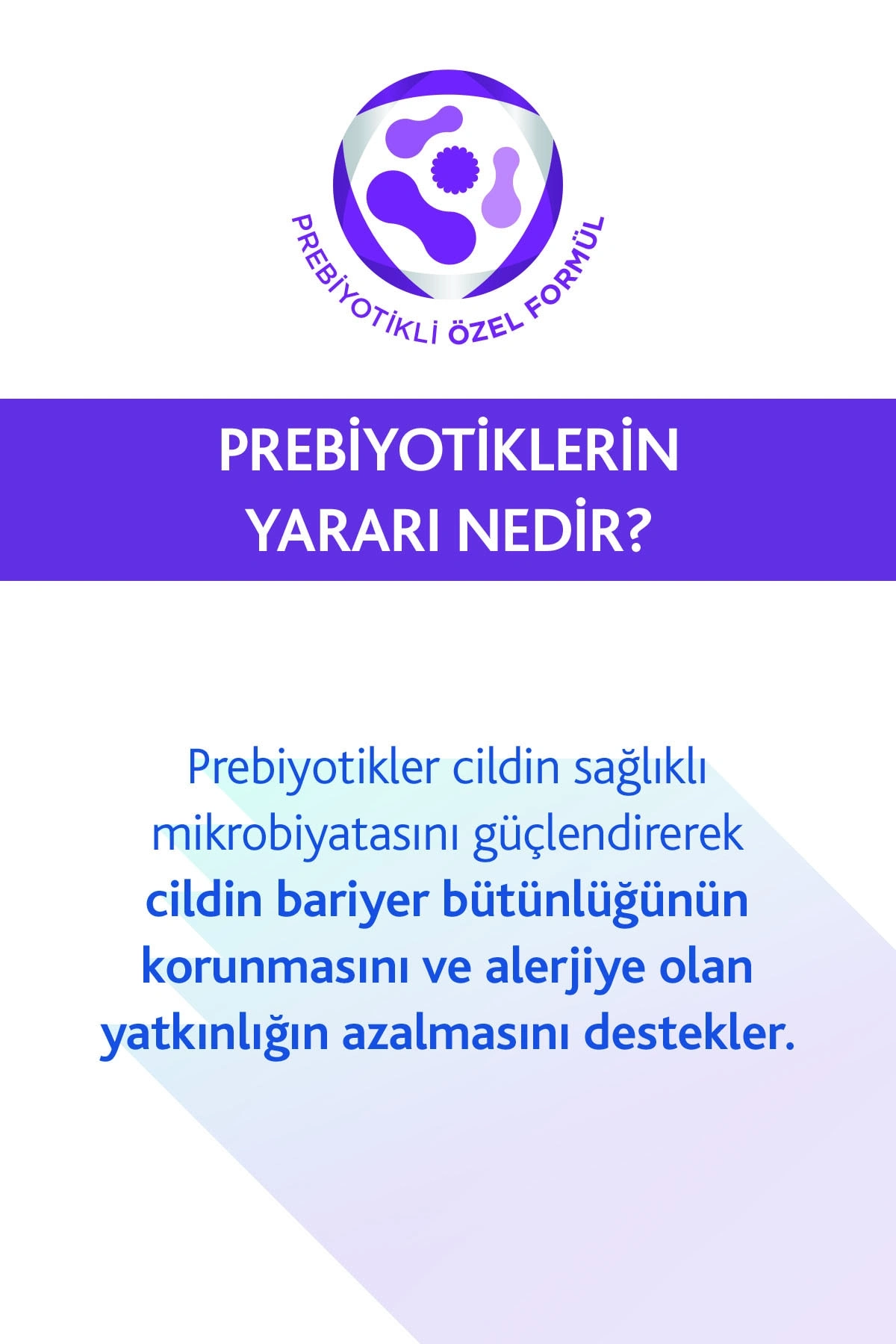 Prebiyotikler cildin sağlıklı mikrobiyatasının güçlendirerek cildin bariyer bütünlüğünün korunmasını ve alerjiye olan yatkınlığın azalmasını desteklerler. Bakteriyel dengesi bozulmuş ciltlerin bariyer bütünlüğünü sağlamak için prebiyotik içeren, uzun süreli ve etkin bir nemlendirme sağlayan kremler tercih edilebilir.