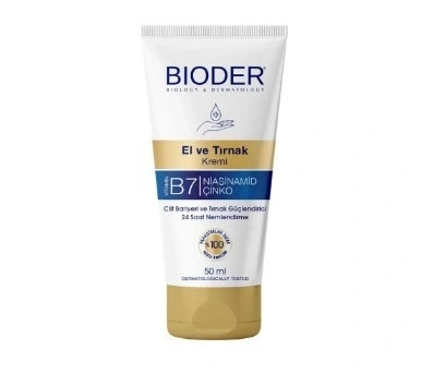Bioder El ve Tırnak Bakım Kremi, içeriğindeki Biotin, Niasinamid ve Çinko sayesinde elleri ve tırnakları besler. Tırnak etlerinin sertleşmesini engellemeye yardımcı olur. Nemlendirir ve kuruluğa karşı etkilidir. Elde yağlı bir his bırakmaz. Hızlı emilir.