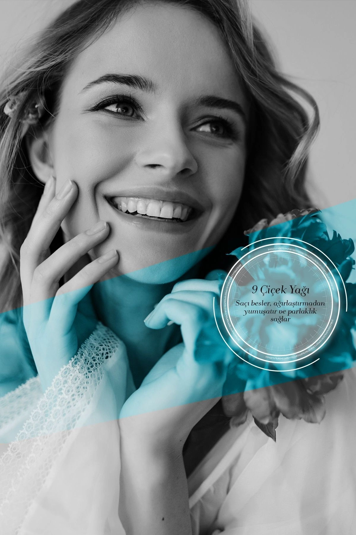 9 Çiçek Yağı (Yasemin, Lavanta, Itır, Lotus, Manolya, Hanımeli, Portakal Çiçeği, Monoi, Gül), kuru ve yıpranmış saçların ihtiyacı olduğu nemi geri kazandırarak sağlıklı bir görünüm sağlar. Saç tellerini onarır, besler, canlandırır ve ipeksi bir yumuşaklık kazandırır.