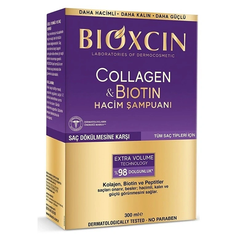 Bioxcin Collagen & Biotin Hacim Şampuanı, ince telli, hacimsiz ve güçsüz saçları içeriğindeki hidrolize kolajen, biotin ve Bio-Activ Peptitler ile dolgunlaştırır ve güçlendirir. Patentli BioComplex B11 ile saç dökülmesini engellemeye yardımcı olur.