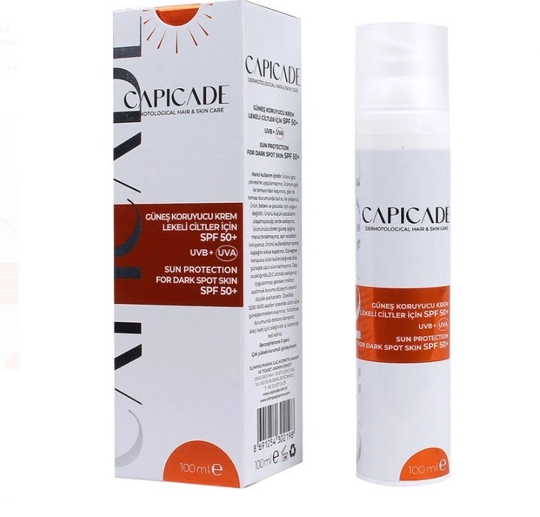 Capicade SPF 50+ Güneş Koruyucu Krem, özellikle lekeli ciltler için geliştirilmiş yüksek koruma sağlayan güneş bakım ürünüdür. Geniş spektrumlu filtre sistemi sayesinde cildi UVA ve UVB ışınlarının zararlı etkilerine karşı korumaya yardımcı olur. Aynı zamanda cilt tonunun daha dengeli görünmesine ve güneş kaynaklı yeni leke oluşumunun önlenmesine destek sağlar.
