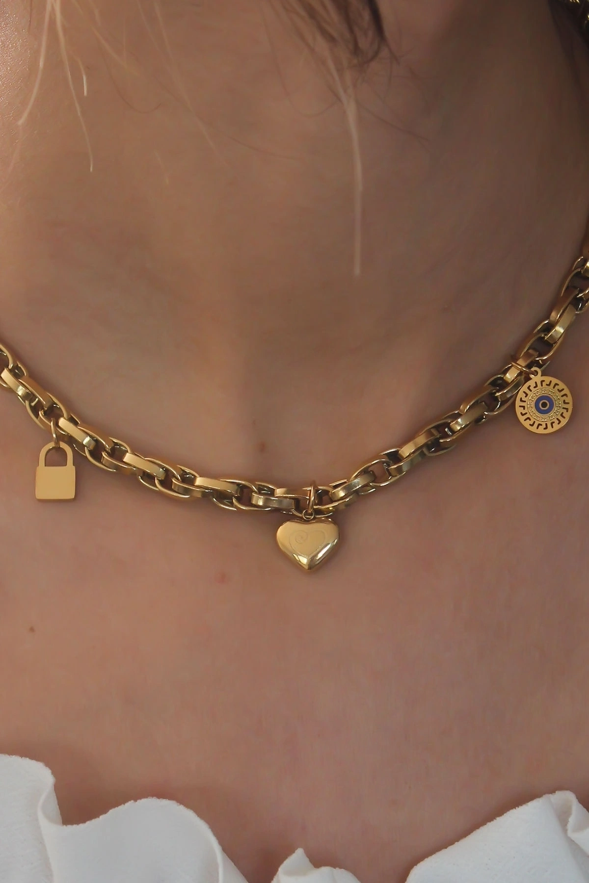Çelik Gold Renk Kalın Zincir Model Kalp Figür Kadın Kolye