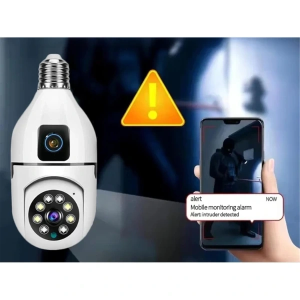 ÇİFT LENSLİ DUY GİRİŞLİ KABLOSUZ AMPUL KAMERAÜrün ÖzellikleriÇift lensli duy girişli kablosuz ampul kamera, pratik kurulumu ve gelişmiş güvenlik özellikleriyle dikkat çeker. E27 duy girişine kolayca monte edilerek ek adaptör gerektirmez. 4K Full HD çözünürlüğü ve 8 MP kamera kalitesi sayesinde net ve yüksek çözünürlüklü görüntüler sunar. 360° panoramik görüş açısı ile geniş alanları kapsar ve kör noktaları ortadan kaldırır.Gece görüş özelliğiyle düşük ışıkta dahi net kayıt alabilen kamera, hareket algılama özelliği sayesinde şüpheli durumlarda anında mesajlı bildirim gönderir. Çift yönlü ses desteği ile hem konuşabilir hem de ortam sesini dinleyebilirsiniz. Wi-Fi bağlantısı ile telefondan kolayca kontrol edilebilir. TF kart desteği ve video kayıt özelliği sayesinde görüntüler güvenli bir şekilde saklanabilir.Paket İçeriği1 adet Çift Lensli Duy Girişli Kablosuz Ampul Kamera