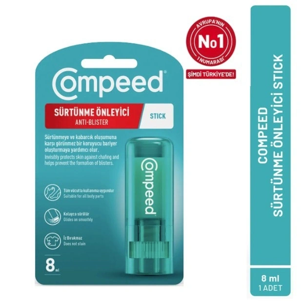 Compeed Sürtünme Önleyici Stick, ayakkabı kaynaklı sürtünme nedeniyle oluşabilecek su toplaması (blister), tahriş ve kızarıklıkların önlenmesine yardımcı olan pratik bir bakım ürünüdür. Ayaklarda koruyucu bir tabaka oluşturarak sürtünmeyi azaltır ve cildin daha konforlu kalmasına destek olur.