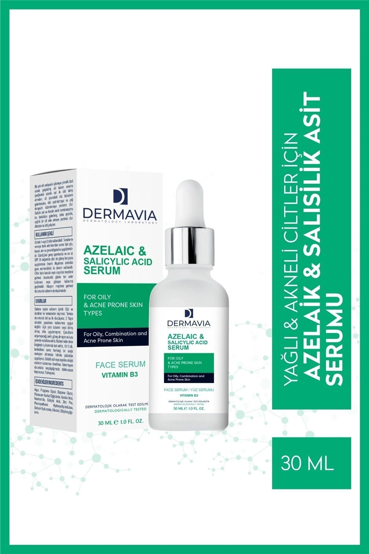 Dermavia Azelaic & Salicylic Acid Yüz Serumu, özellikle yağlı ve akneye eğilimli ciltler için geliştirilmiş, ciltteki fazla sebumu dengelemeye, gözenek görünümünü azaltmaya ve cilt tonunu eşitlemeye yardımcı olan bir bakım serumudur. İçeriğindeki azelaik asit ve salisilik asit sayesinde cildinizi arındırır, yatıştırır ve daha sağlıklı bir görünüm kazanmasına katkı sağlar.