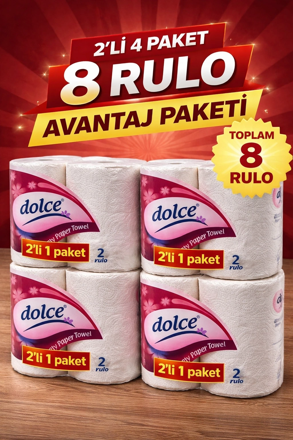Dolce Çift Katlı Kağıt Havlu 2'li Rulo 4 Paket Yüksek Emicili Çok Amaçlı Kağıt Havlu Toplam 8 Rulo