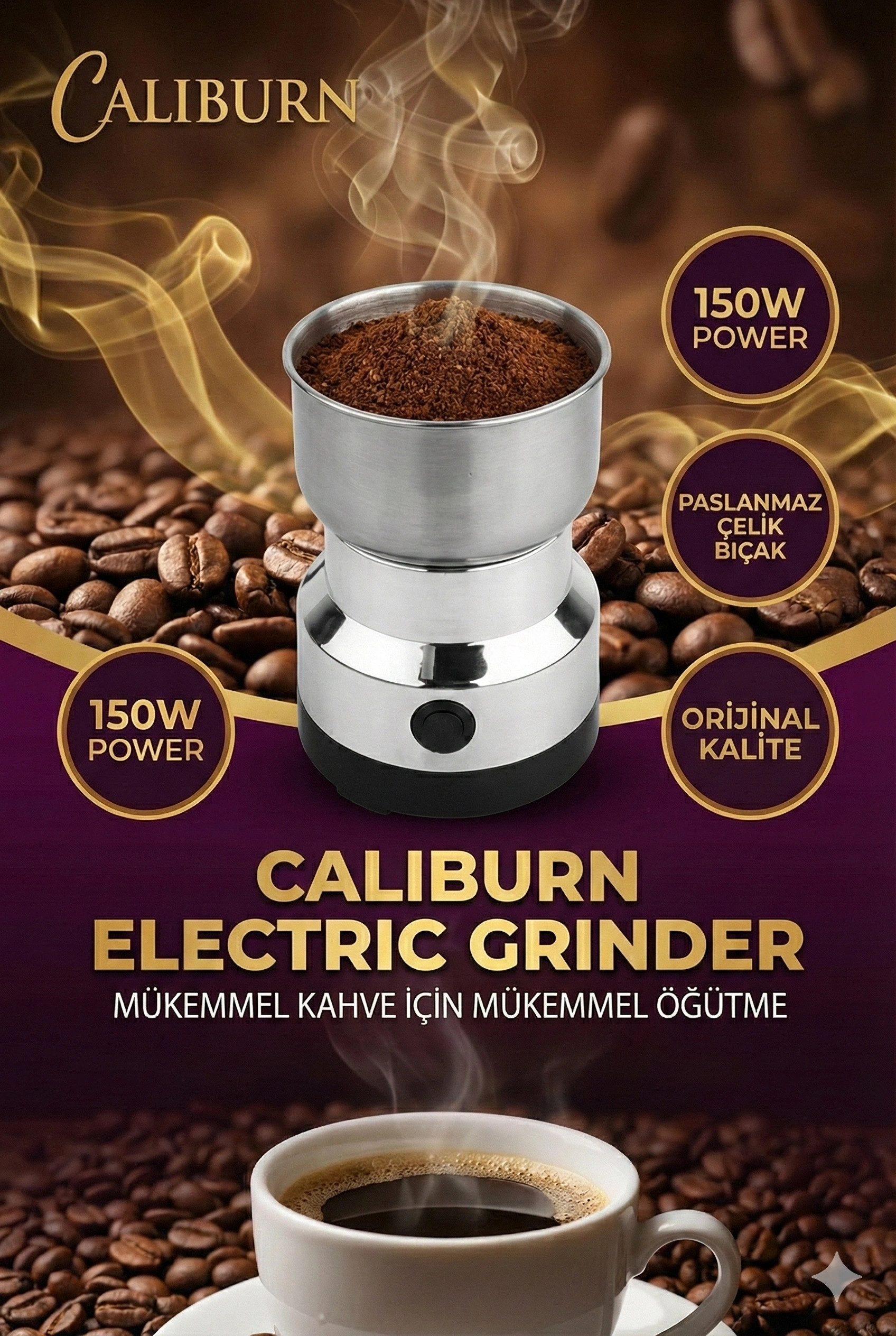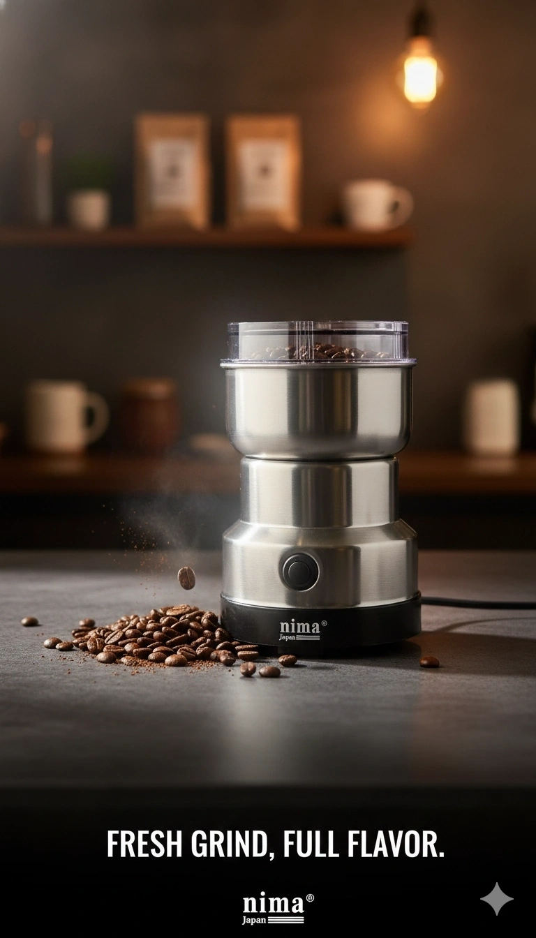 Elektrikli kahve öğütücümüz tek elle kolayca tutulabilir ve kompakt tasarımı tezgahta minimum yer kaplar, ayrıca bir dolap veya çekmecede saklaması kolaydır.