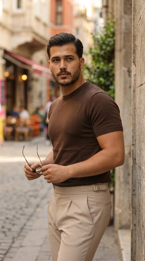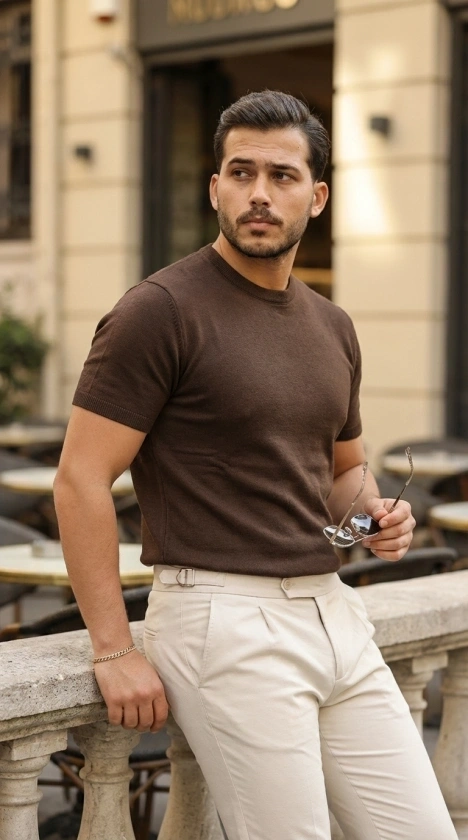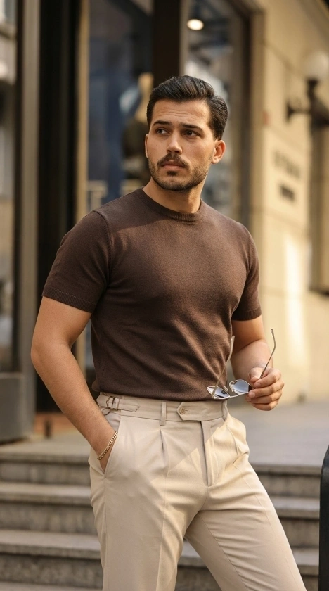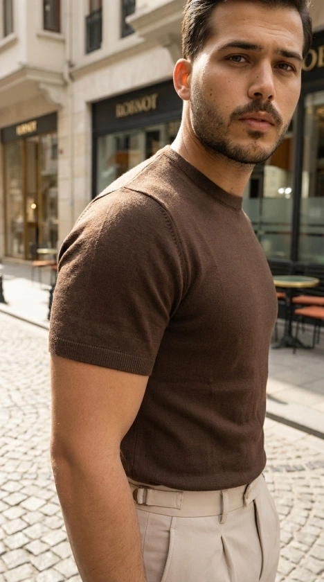 Erkek Yazlık Fitilli Triko Tişört Kısa Kol Bisiklet Yaka T-Shirt - Kahverengi