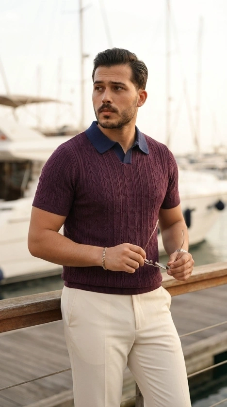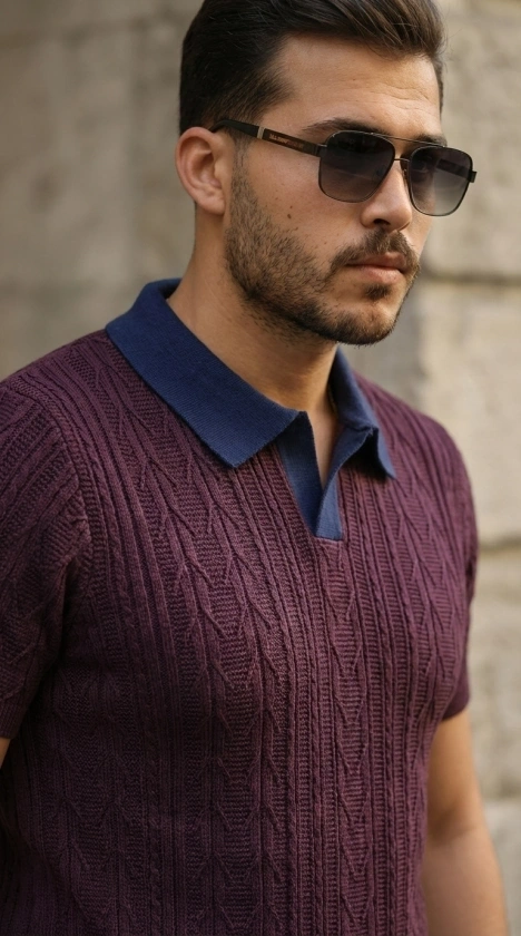 Erkek Kısa Kol Fitilli Triko T-Shirt Yazlık Hakim Yaka Tişört - Lacivert
