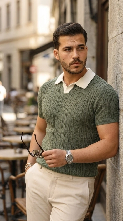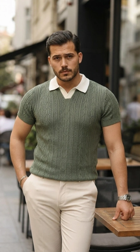 Erkek Kısa Kol Fitilli Triko T-Shirt Yazlık Hakim Yaka Tişört - Bej