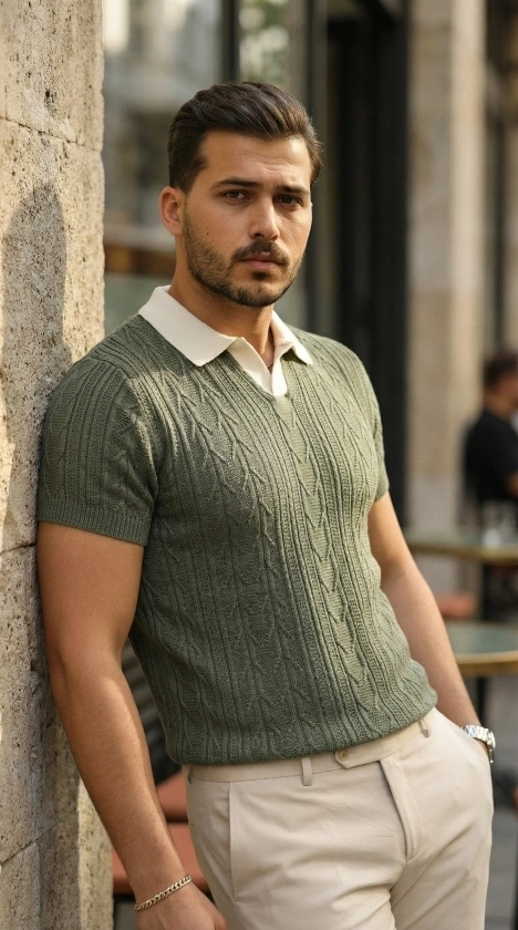Erkek Desenli Kısa Kollu Triko Tişört - %100 Pamuk Akrilik