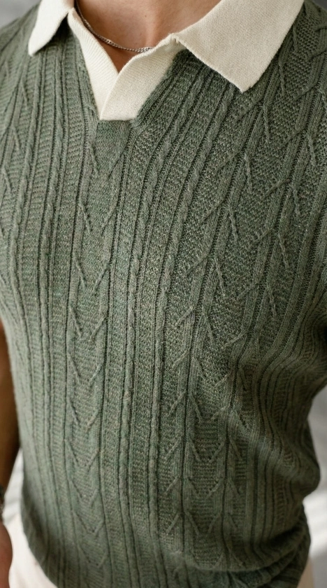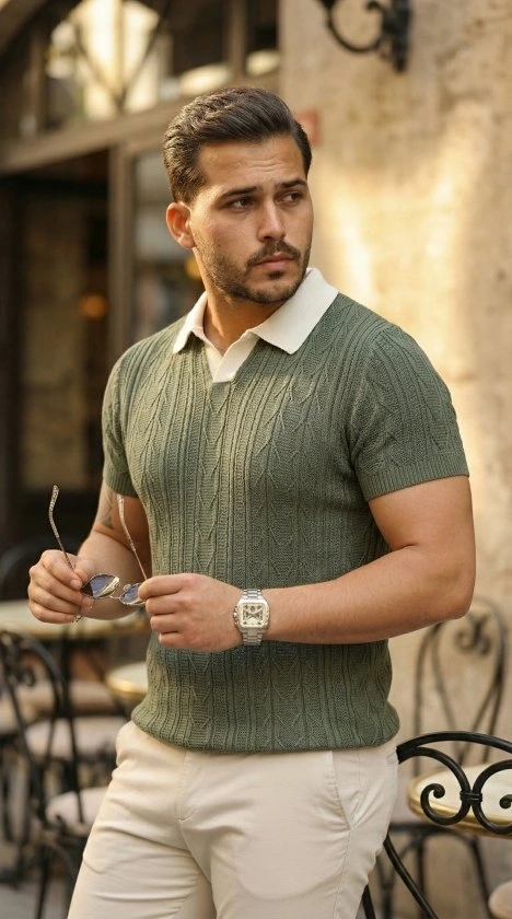 Erkek Triko Polo Yaka Fermuarlı Çizgili Tişört T-Shirt Yazlık Şık - Yeşil