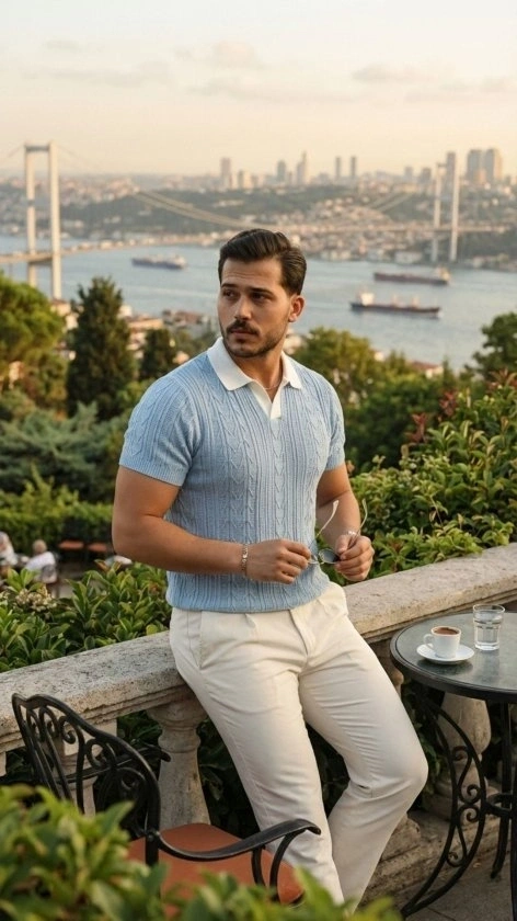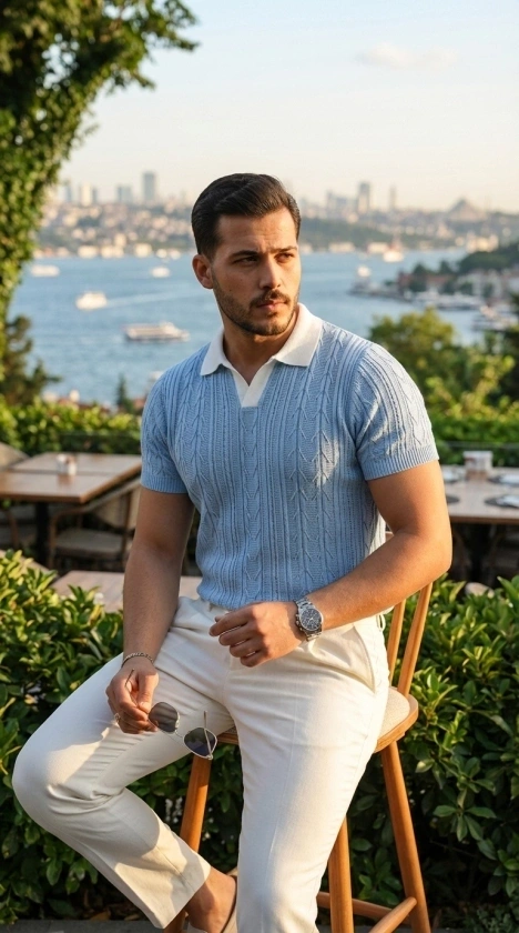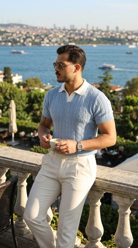 Erkek Kısa Kol Fitilli Triko T-Shirt Yazlık Hakim Yaka Tişört - Bebek Mavisi
