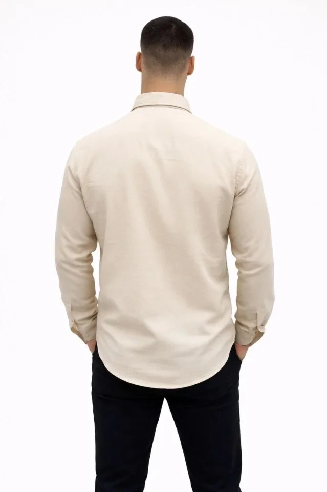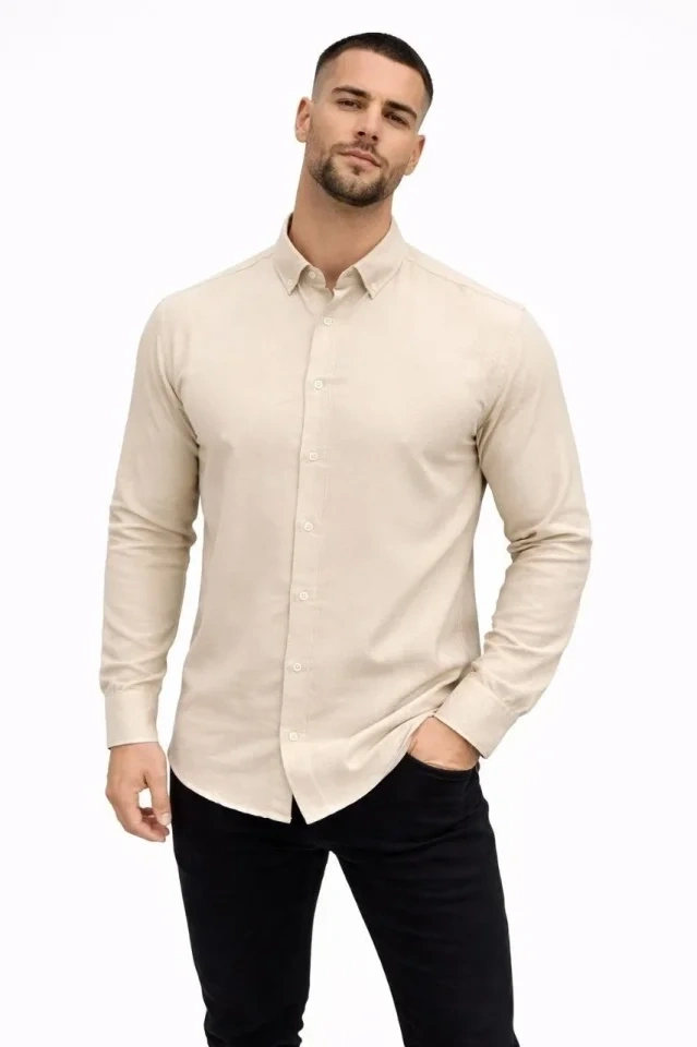 Erkek KETEN Kumaş Oversize Uzun Kollu Rahat Kalıp Gömlek - Bej