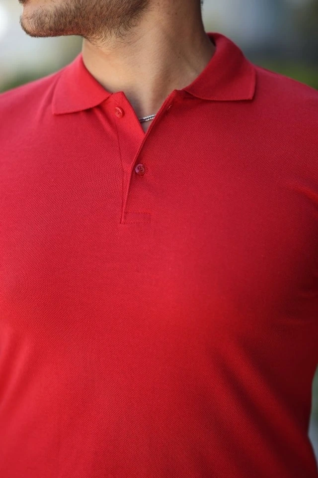 Erkek Pike Kumaş Düğmeli Yaka Battal Büyük Beden Günlük Kısa Kol Tişört T-shirt - Kırmızı