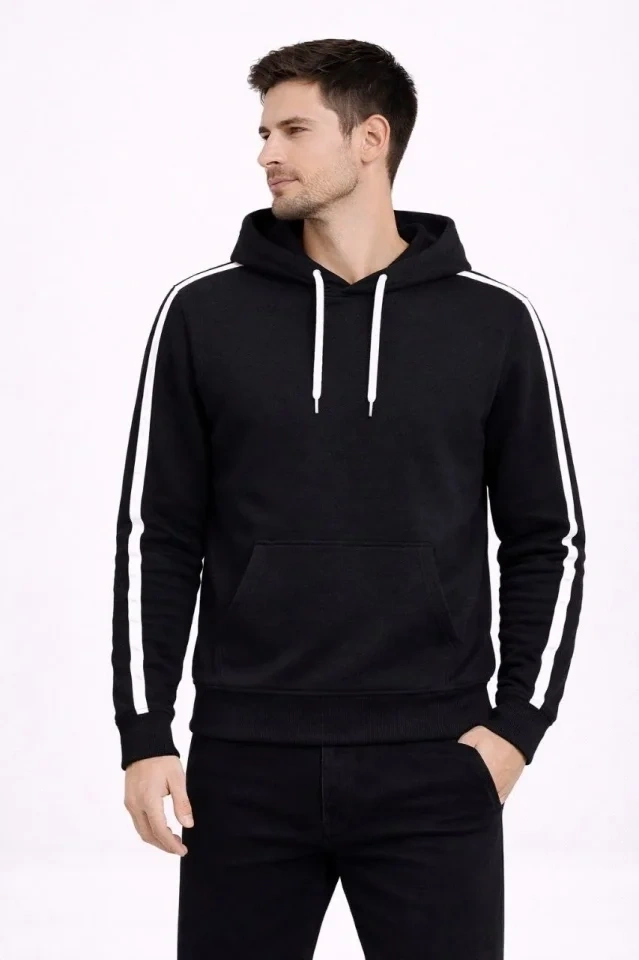 Erkek Şeritli Kapüşonlu Sweatshirt Oversize 3 Iplik Pamuklu - Siyah