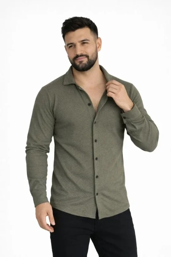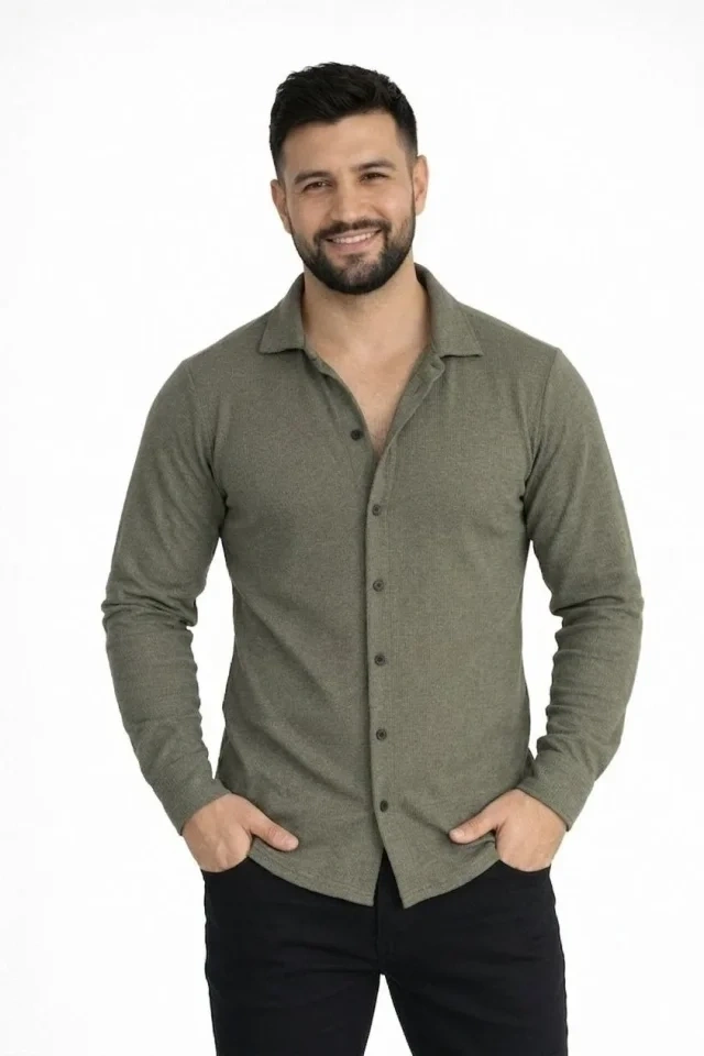 Erkek Waffle Kumaş Uzun Kollu Düğmeli Açık Yaka Regular Fit Gömlek - Haki