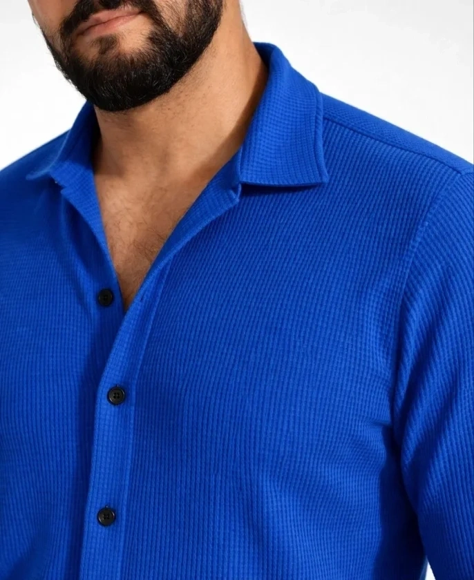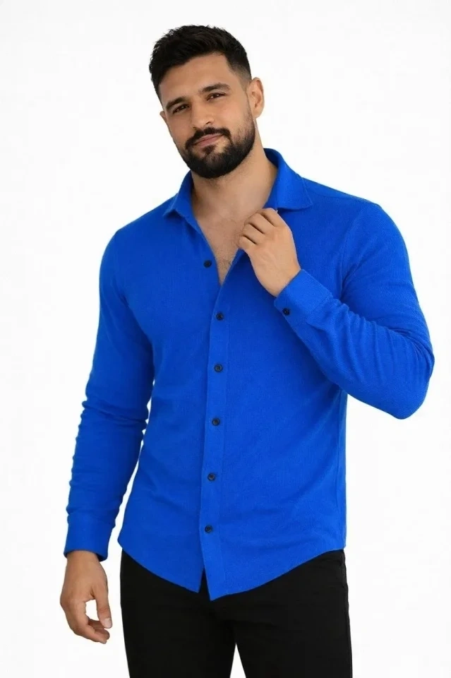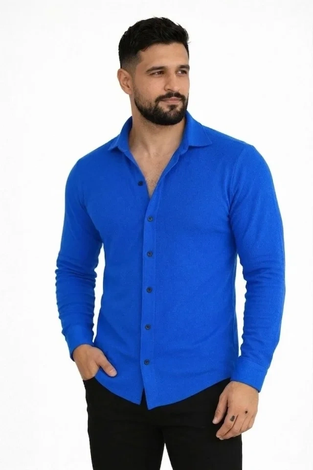 Erkek Waffle Kumaş Uzun Kollu Düğmeli Açık Yaka Regular Fit Gömlek - Saks Mavisi