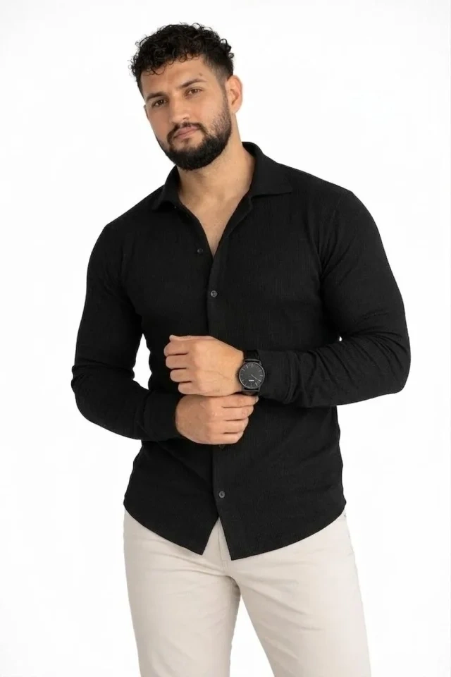 Erkek Waffle Kumaş Uzun Kollu Düğmeli Açık Yaka Regular Fit Gömlek - Siyah