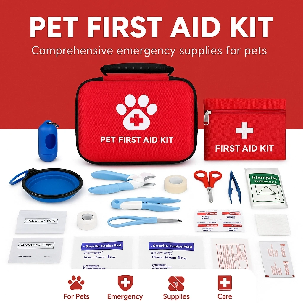 EVCİL HAYVAN LÜKS İLK YARDIM VE İHTİYAÇ SETİ ÇANTASIÜrün ÖzellikleriEvcil Hayvan Lüks İlk Yardım ve İhtiyaç Seti Çantası, evcil dostlarınızın acil durumlarda güvenliği ve sağlığı için özel olarak hazırlanmıştır. Dayanıklı yapısı sayesinde uzun süre kullanılabilir ve her an yanınızda bulundurabileceğiniz pratik bir üründür. İçerisinde gazlı bez, makas, bandaj ve benzeri temel ilk yardım malzemeleri düzenli şekilde yer almakta olup, seyahatlerde veya günlük kullanımda acil müdahaleler için idealdir. Kompakt tasarımı sayesinde kolayca taşınabilir ve saklanabilir. Kapalı formda kırmızı renkli çantasıyla dikkat çeker ve sağlık temasını güçlü bir şekilde yansıtır.1 adet Katlanabilir Mama Kabı1 adet Pire Tarağı1 adet Törpülü Tırnak Makası1 adet Çantalı Dışkı Poşeti1 adet Bandaj Rulo1 adet Hap Yutturma Aparatı6 adet Steril Gazlı Bez5 adet Yara Bandı1 adet Gazlı Bez Rulo4 adet Povidon-iyot Hazırlama Pedi10 adet Alkollü Temizleme Bezi1 adet Sargı Bandı Rulo1 adet Plastik Cımbız1 adet Makas1 adet Düdük1 adet Silikon Bandaj1 adet Üçgen Bandaj (96×96×136 cm)10 adet Çengelli İğne1 adet Basmalı CımbızPaket İçeriği1 x Evcil Hayvan İlk Yardım ve İhtiyaç Seti Çantası (tam dolu)