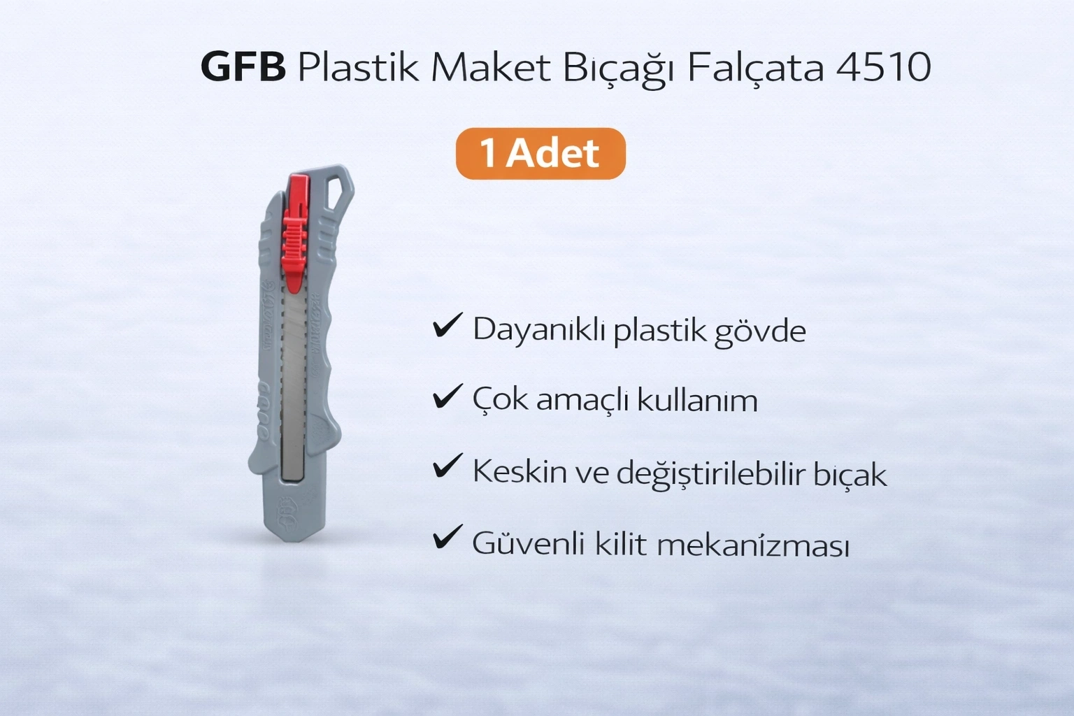 GFB Plastik Maket Bıçağı Falçata 4510 Profesyonel Maket Bıçağı 1 Adet GFB Plastik Maket Bıçağı 4510, dayanıklı plastik gövdesi ve keskin değiştirilebilir bıçak yapısı ile pratik ve güvenli kullanım sunar. Karton, koli bandı, ambalaj, strafor, kağıt ve benzeri malzemelerin kesiminde etkilidir. Ergonomik tasarımı sayesinde elde rahat kavrama sağlar. Kilit mekanizması ile bıçak sabitlenerek kontrollü kesim yapılmasına yardımcı olur. Ev, ofis, depo, kırtasiye ve profesyonel kullanım için uygundur. Ürün Özellikleri: