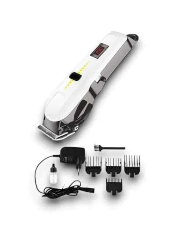 Profesyonel Şarjlı Saç ve Sakal Kesme Makinesi Profesyonel kuaförlerin tercihi olan  Profesyonel saçlı saç ve sakal kesme makinesi mükemmel tutuş ve kavrama sağlamak için özel olarak tasarlanmıştır. Ergonomik özelliklerinin yanı sıra yenilikçi ve şık görünüme sahiptir Keskin ve Dayanıklı Çelik Bıçaklar Profesyonel saç ve sakal kesme makinesi, en sert kılların bile tek seferde kesilmesini sağlayan keskin ve dayanıklı çelik bıçaklara kusursuz kesim performansı ortaya koyar. Uzun ömürlü olması için birinci sınıf kalitedeki materyalden üretilmiştir Uzun Kullanım Süresine Sahip Lityum Batarya Kablosuz kullanım rahatlığına sahip  Profesyonel saç ve sakal kesme makinesi uzun kullanım süresine sahiptir. Yaklaşık 4 saatte maksimum şarja ulaşan lityum bataryası sayesinde 150 dakikaya kadar kesintisiz saç ve sakal kesme imkanı tanır Güçlü ve Sorunsuz Motor Avantajı 220-240 V 50/60 Hz 3W voltaj seviyesine sahip güçlü motora sahiptir. Motor gücü 3.6 Volttur. Bu sayede hem saç hem de sakal kesiminde sorun yaşamadan profesyonel tıraş avantajı sunar Islak ve Kuru Tıraşa Uygun Tasarım Profesyonel kuaförlerin tercihi  Profesyonel saç ve sakal kesme makinesi hem ıslak hem de kuru saç ve sakal kesiminde kullanılabilir Profesyonel Kesim İçin Kılavuz Tarak Aksesuarları Her saç ve sakal kesim tarzına mükemmel uyum için 4 adet kılavuz tarağı ile birlikte gelir.