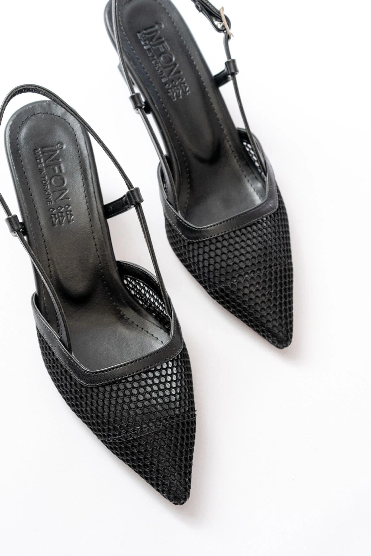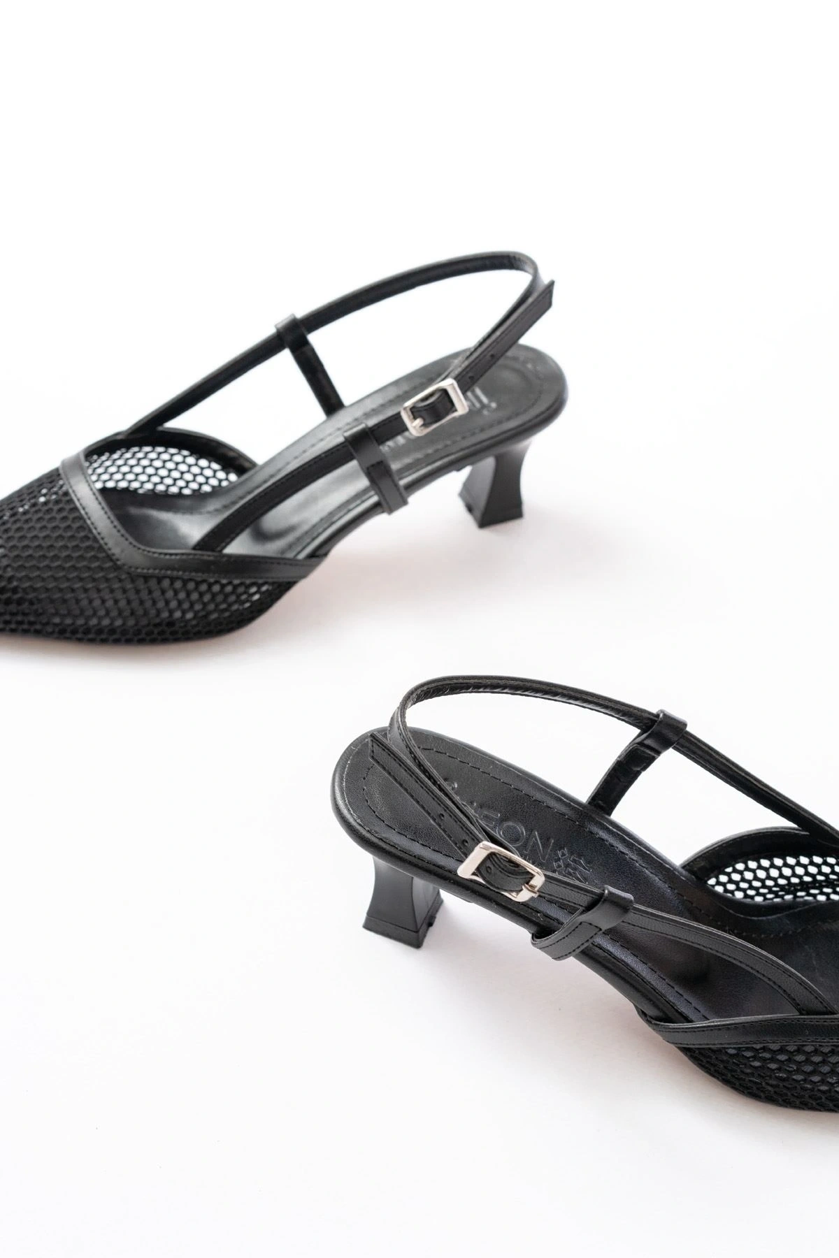 K-607 Siyah Günlük Fileli Arkası Açık 7 cm Topuklu Bayan Ayakkabı