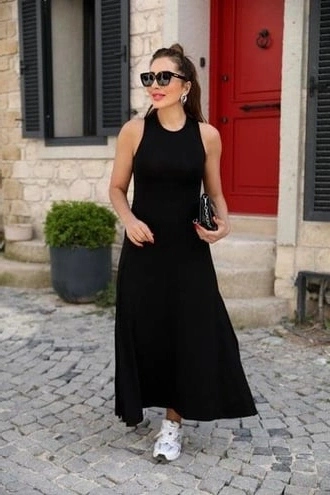 Kadın Arkadan çapraz Detay Yuvarlak Yaka Maksi Viskon Elbise