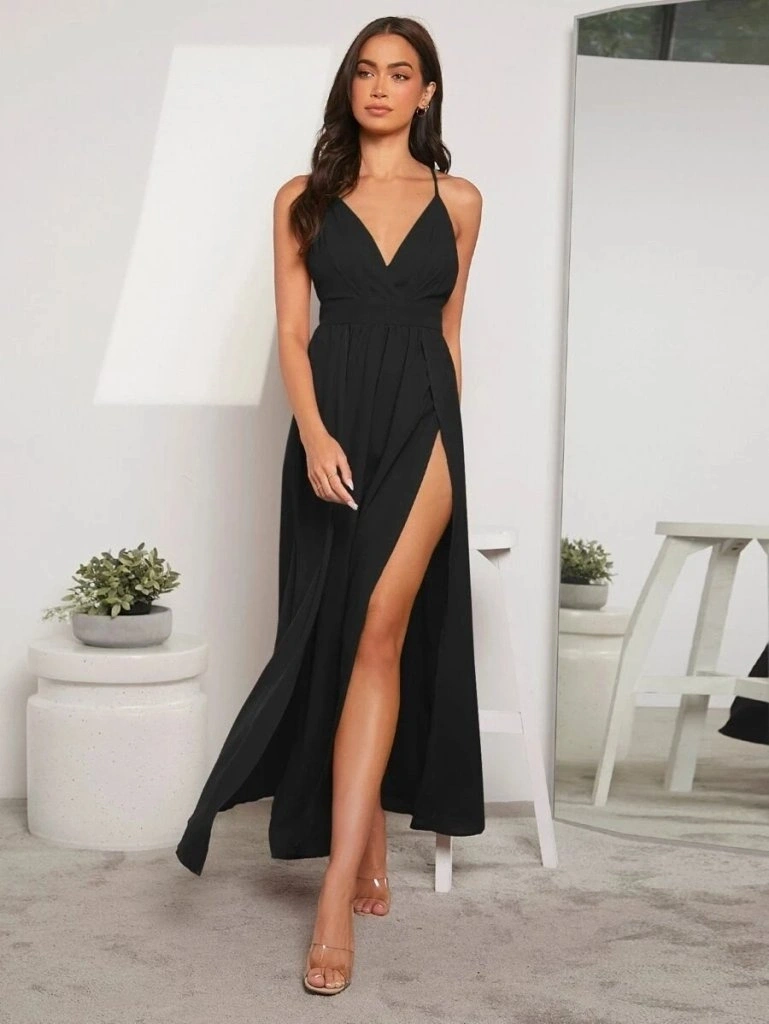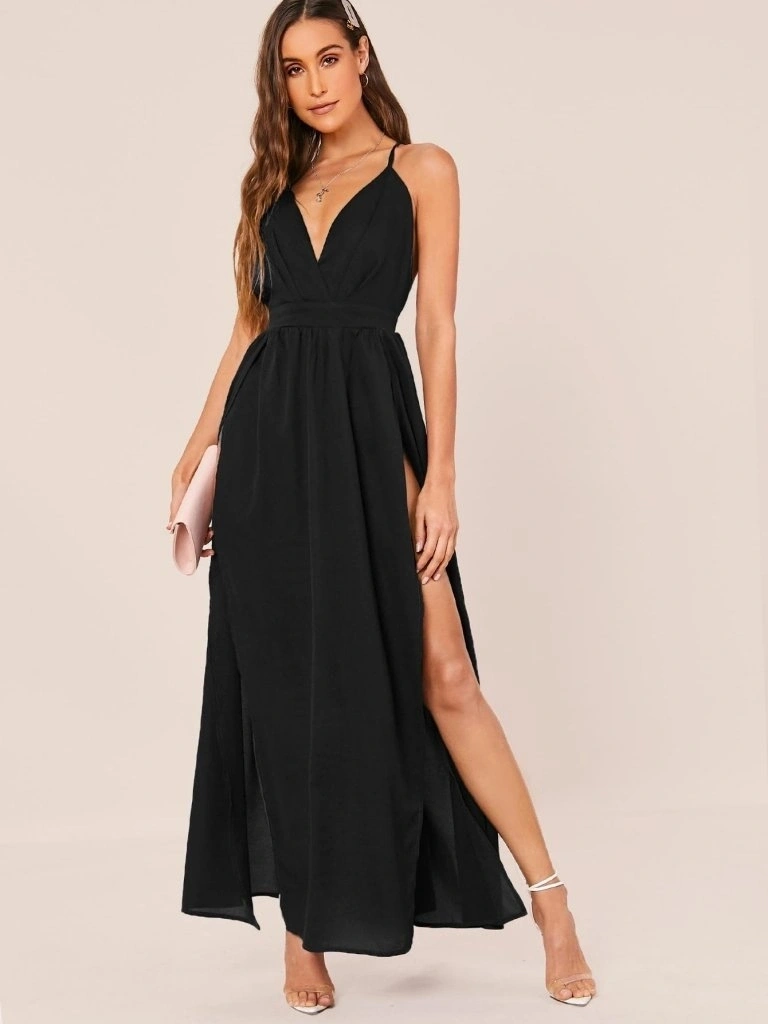 Kadın Ip Askılı Kruvazeli Yırtmaç Detaylı Yerli Krep Uzun Elbise