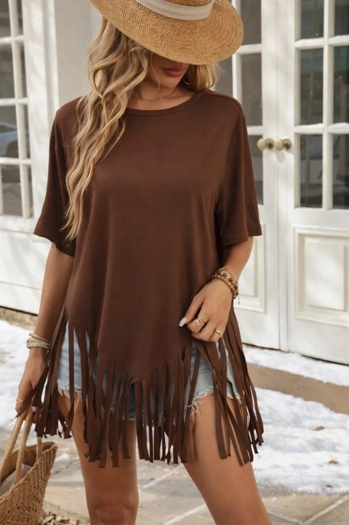 Kadın Kısa Kollu Bisiklet Yaka Püsküllü Viskon Bluz