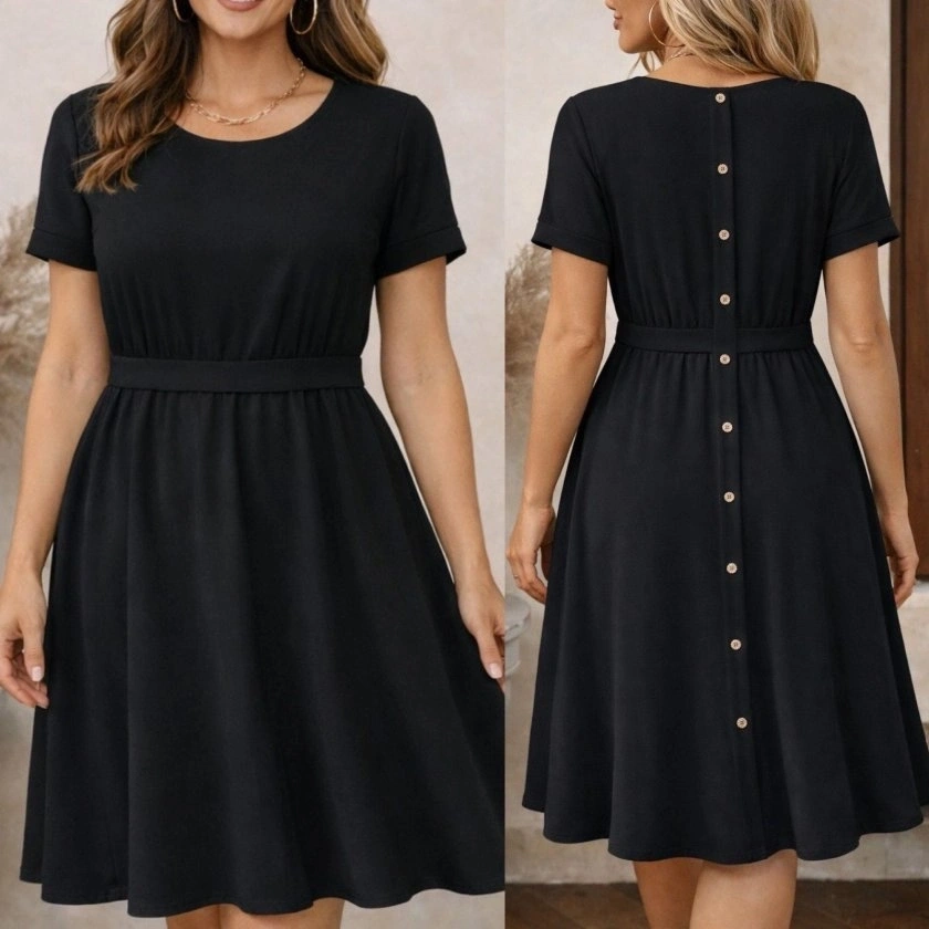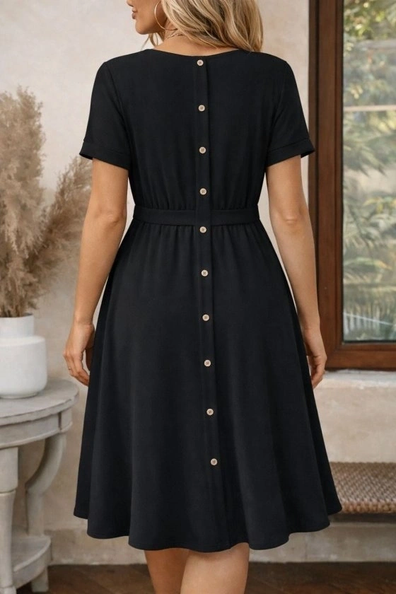 Kadın Kısa Kollu Yuvarlak Yaka Arkadan Düğmeli Viskon Midi Elbise