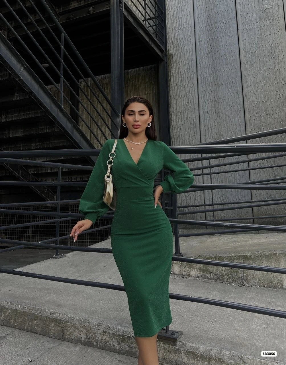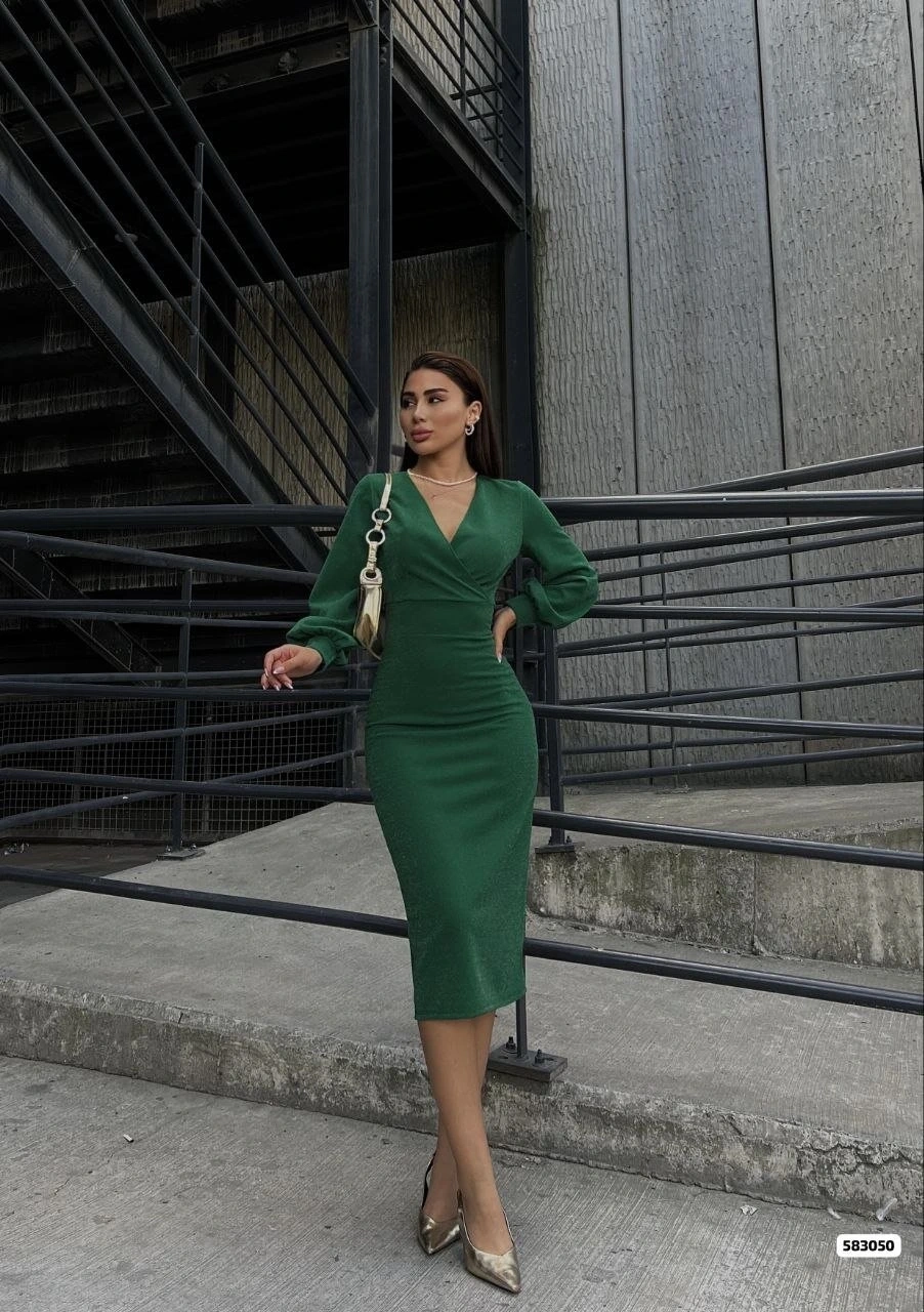Kadın Kruvaze Yaka Balon Kol Simli Krep Kumaş Midi Boy Elbise