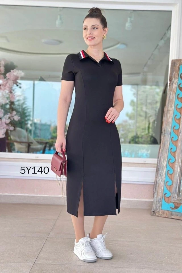 Kadın Yaka Ribanalı Çift Yırtmaçlı Elbise